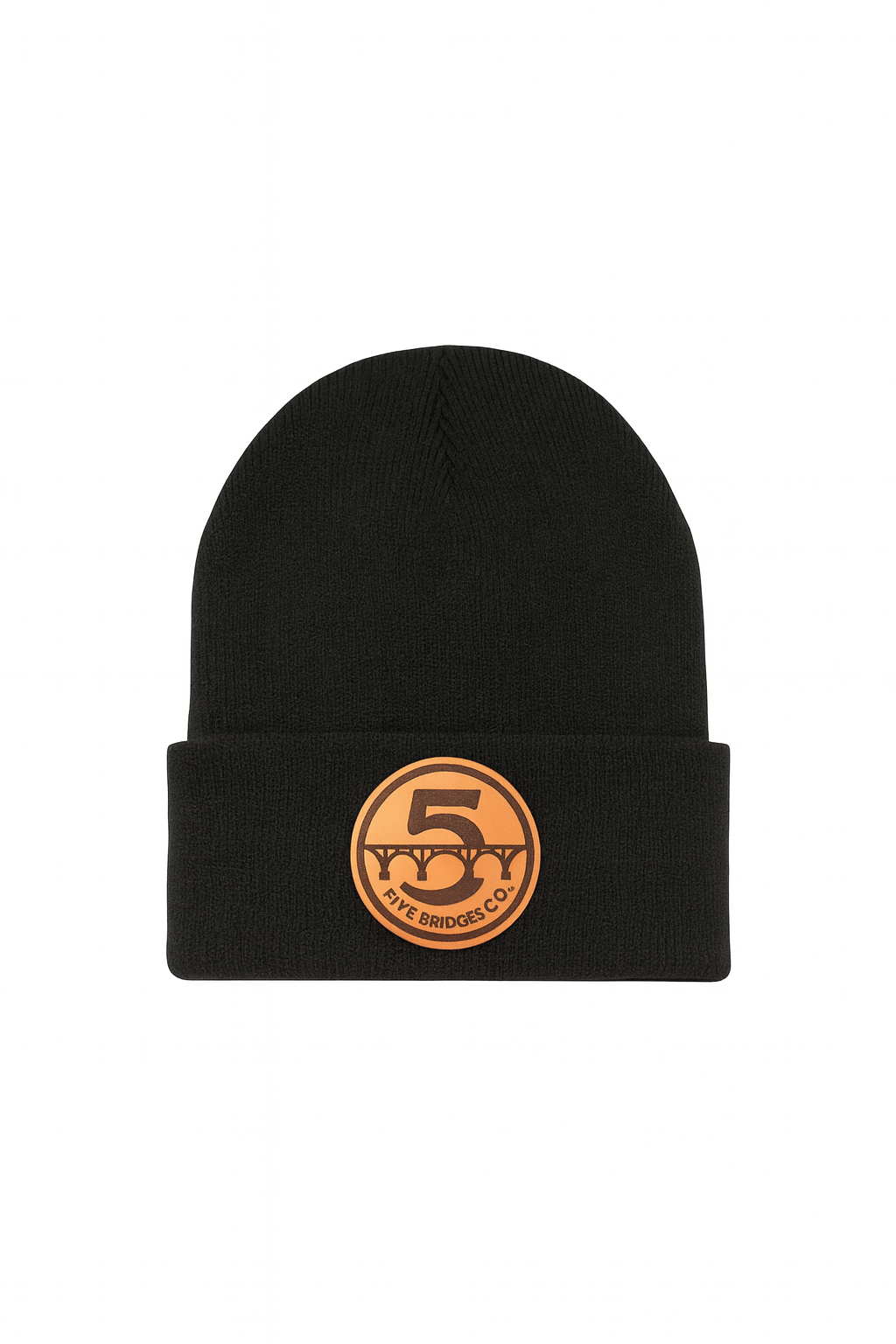 Stay warm and represent Macon with the Five Bridges Co. classic black beanie. Featuring our signature leather patch and a clean, timeless design, this beanie is perfect for chilly mornings, river days, and everyday wear.