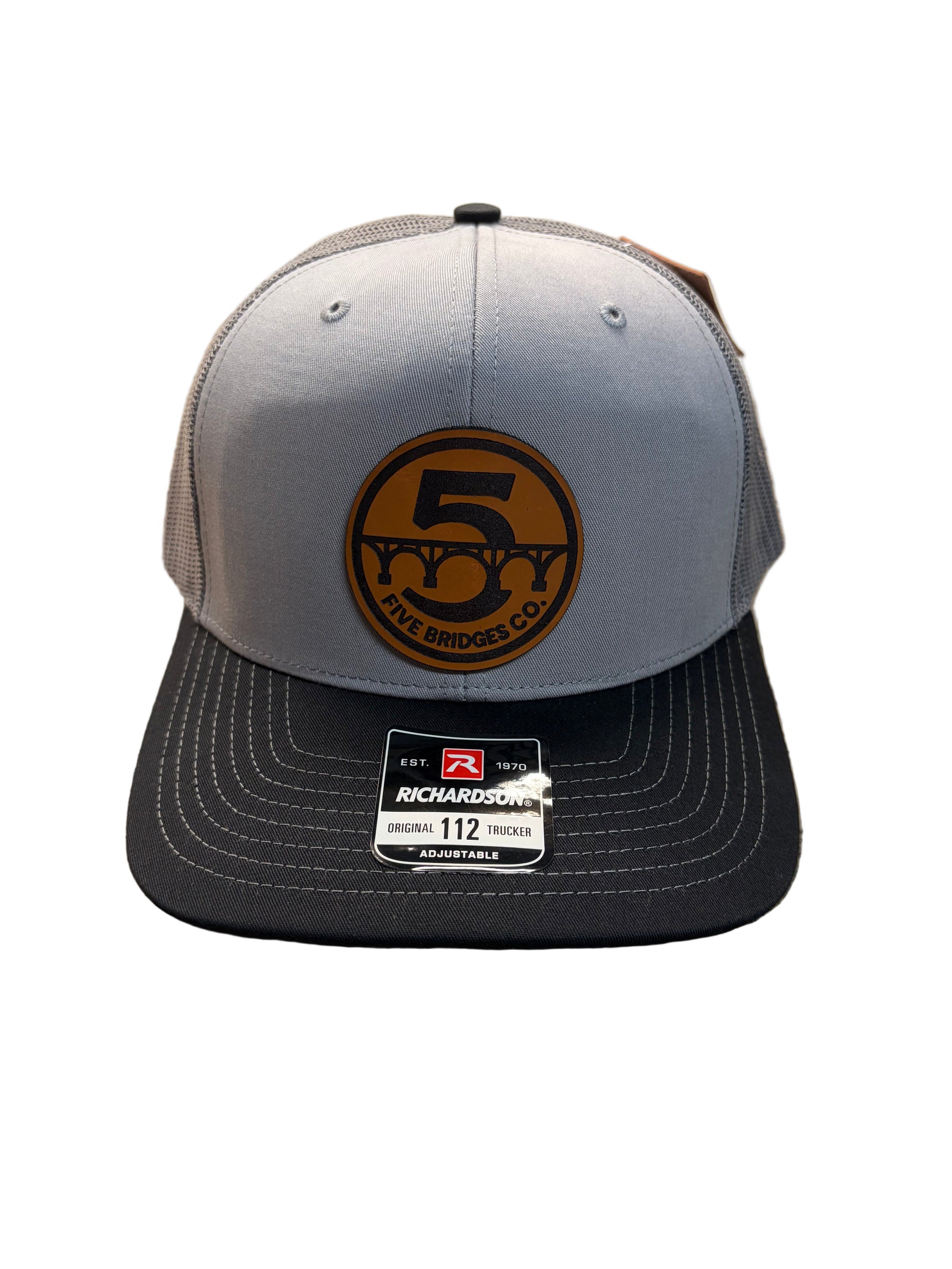 Rep your hometown with the clean, classic look of the Five Bridges Co. patch hat. This Richardson 112 trucker cap features a gray crown, black bill, and our signature leather patch — built for the outdoors, everyday wear, and anyone proud to call Macon home.